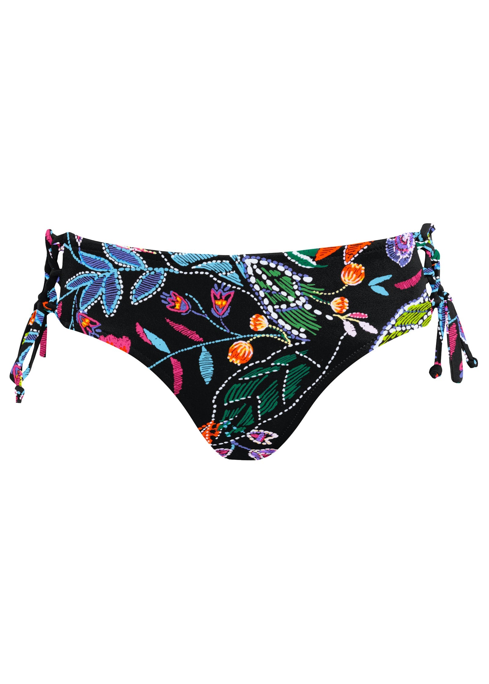 Lattice detailing at hips with adjustable ties for perfectly fitting, full rear coverage bikini bottoms.