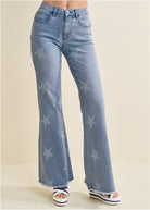 Reveal your star quality in this pair of flare jeans! Graphic stars print these jeans from top to bottom, bringing a festive feel to your classic blues. The wide legs finish with a frayed hem for edgy appeal that makes these a denim standout worthy of your jeans rotation.