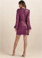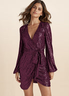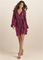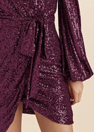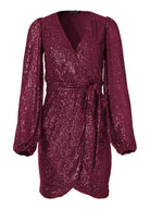 Belted Sequin Wrap Dress - Wine